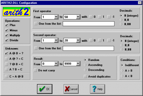 There is a file called ARITH2.DLL in the C:\Clic\Act\Demo folder. This is a special programme that acts as an external compliment to Clic, generating mental calculation operations at random based on certain criteria set when making an activity.