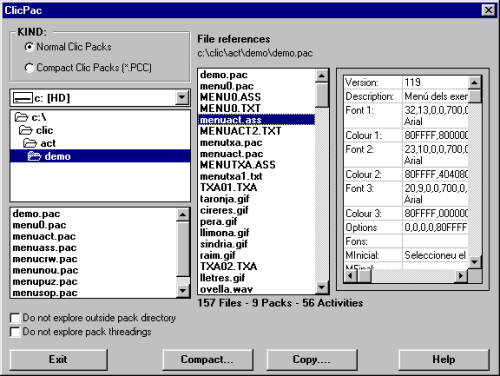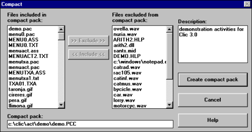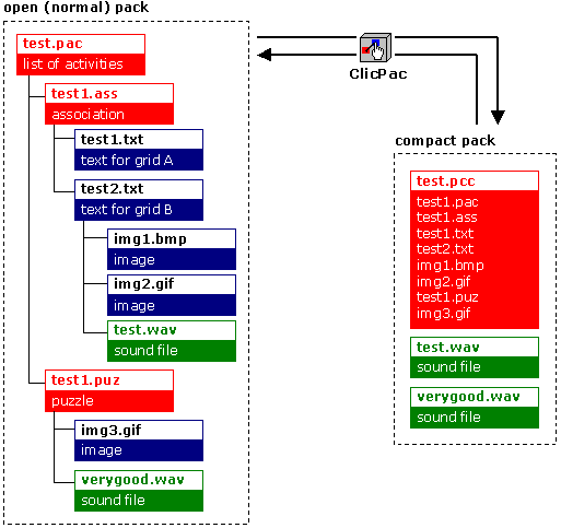 As we saw at the beginning of the course, Clic packs can be presented in one of two formats: normal packs (.PAC) and compact packs (.PCC). The basic difference between the two types of packs is in the information contained in the files. The PAC packs only contain references to the activities (we could say they are like a "shopping list"), while the PCC packs contain most of the necessary ingredients to make them work (following the same analogy, they would be the equivalent to a "shopping basket"). Multimedia files can never be put in the "basket" and have to stay as independent elements in the working directory.
