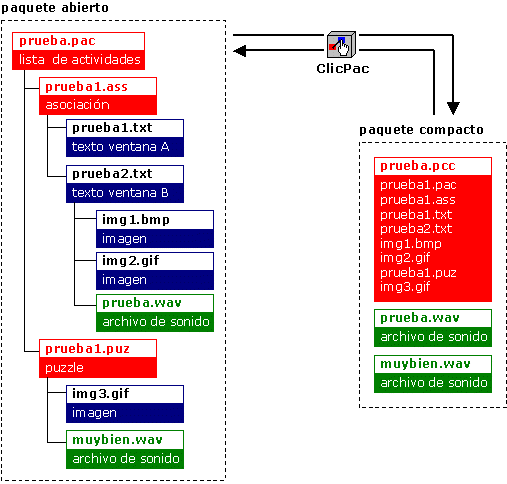 Tal como se vio al principio del curso, los paquetes Clic se pueden presentar en dos formatos distintos: Los paquetes abiertos (extensión PAC) y los paquetes compactos (extensión PCC). La diferencia fundamental entre los dos tipos de paquetes se da en el tipo de información que reside en los archivos: Los PAC contienen sólo referencias a los nombres de las actividades (podríamos decir que son como la lista de la compra), mientras que los PCC contienen la mayor parte de los ingredientes necesarios para hacerlas funcionar (siguiendo la analogía anterior, serían el equivalente al cesto con la compra). Los archivos multimedia no se pueden poner nunca en el "cesto" y tienen que quedar como elementos independientes en la carpeta de trabajo.