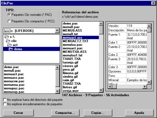 - Seleccionar el archivo correspondiente al paquete principal. El programa analizará las dependencias entre los diversos ingredientes de la aplicación, y si detecta algún error (por ejemplo, una llamada a un archivo inexistente) lo comunicará. Si hay errores hay que cerrar ClicPac, revisar la actividad que los ha provocado, solucionarlos y volver a empezar.