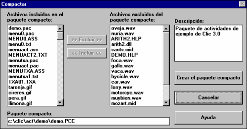 - En la pantalla que aparece a continuación se muestra a la izquierda la lista de todos los archivos que pasarán a formar parte del paquete compacto, y a la derecha la de los que quedarán excluidos (archivos WAV, MID, AVI, DLL...):
